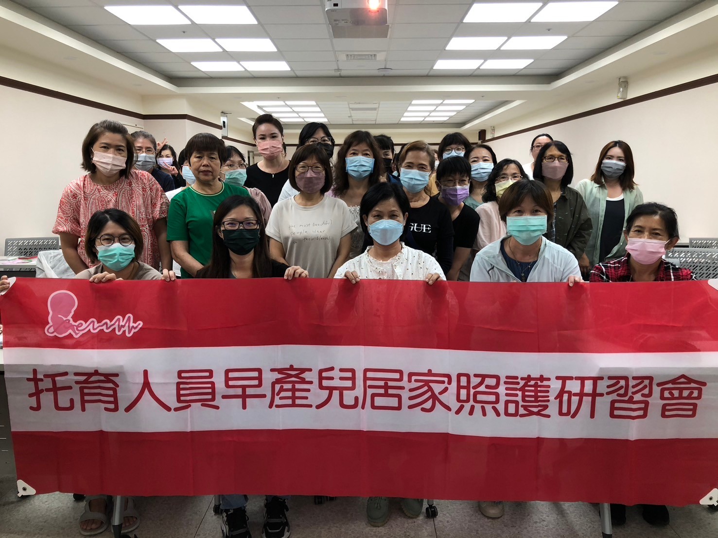 早產兒居家照護教育宣導(1)托育人員早產兒居家照護研習會有鑒於早產兒的誕生為家庭帶來之衝擊,返家後的早產兒居家照護及其家庭面臨挑戰,如何讓早產兒在返家後延續良好的照顧及生活品質,是本會所努力的目標之一。然現代社會雙薪家庭比重提高,極需倚重專業保母人員協助父母照顧返家的早產兒,而保母人員極容易因不熟悉早產兒之特性與照護方式,進而婉拒照顧,讓早產兒及其照顧系統陷入危機。早產兒基金會自100年起分別於北、中、南…等地區舉辦『早產兒居家照護—保母人員研習會』,邀請各區保母從業人員共同進修早產兒居家照護課程。課程內容包含認識早產、早產兒異常徵象之評估與處理、早產嬰幼兒之生長與發育評估、早產兒居家照護技巧與常用儀器設備簡介、早產嬰幼兒之營養與副食品添加、社會資源之運用。期盼藉由課程訓練,讓保母人員對早產兒有正確的認知,提升照顧早產兒的意願,進而協助早產兒家庭於早產兒返家之照護困境。