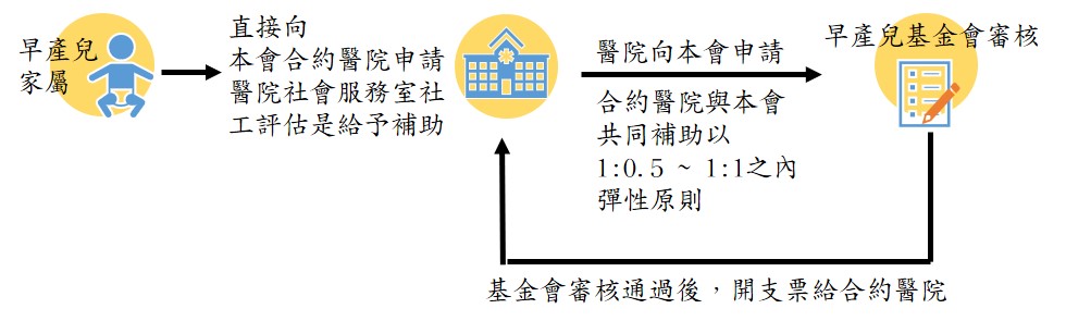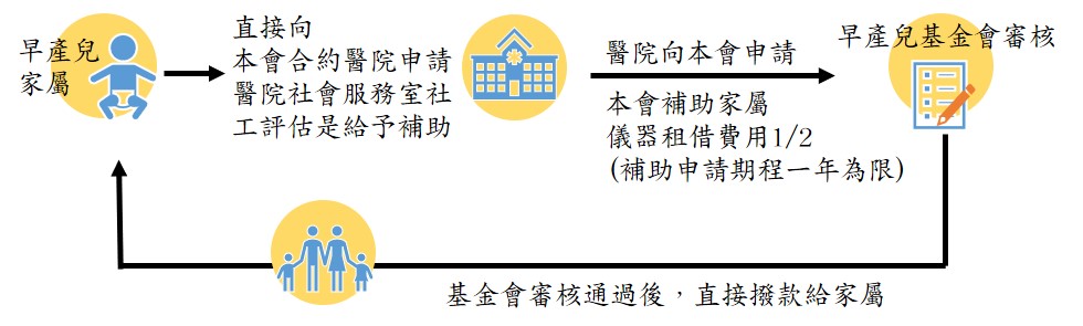 早產兒基金會結合全國合約醫院,提供早產兒住院中醫療補助或出院後居家照顧醫療儀器租借費用補助。非合約醫院不提供補助。